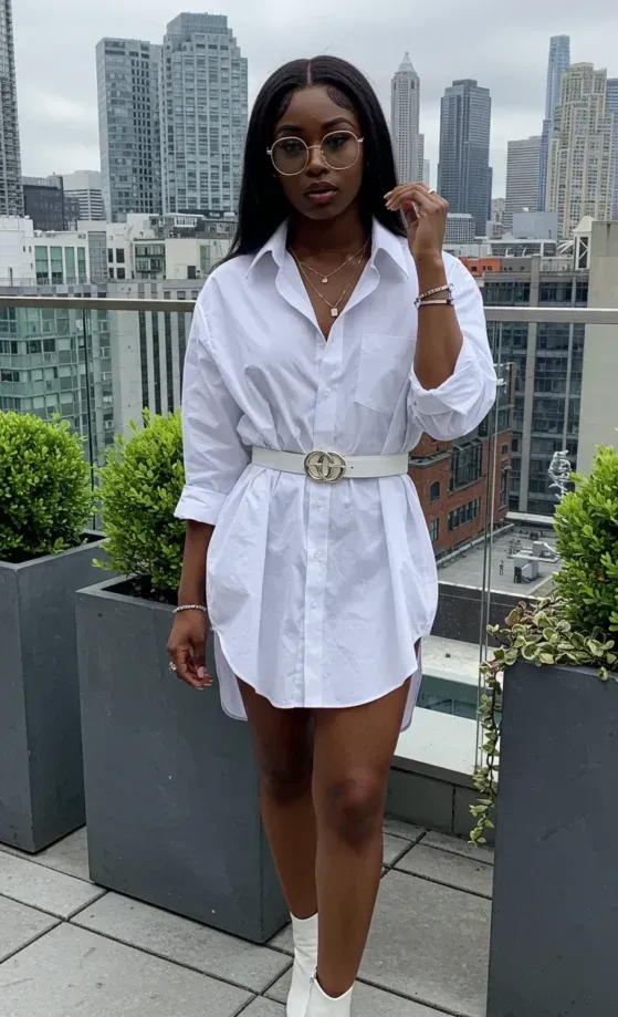 This sophisticated yet relaxed white shirt dress is perfect for showcasing effortless chic. Featuring a classic collared design and a high-waisted belt, the dress flatters the figure while keeping the comfort factor at the forefront. The oversized shirt style has a modern touch with its unique, tucked-in belt, making it a standout piece for both casual and slightly dressier occasions. Paired with white boots, this outfit radiates clean, minimal vibes that can easily be dressed up or down depending on your accessories.