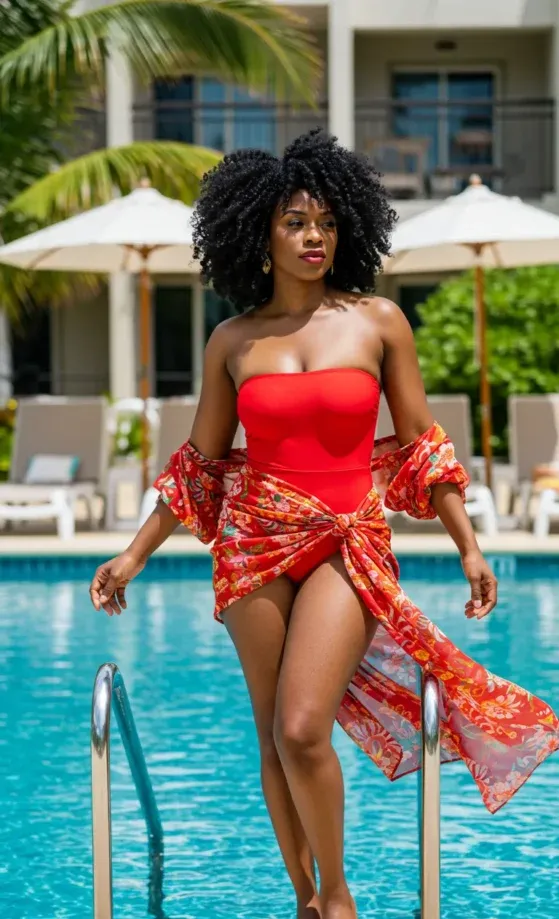This vibrant swimsuit look is all about bold color and effortless elegance. The bright red strapless one-piece swimsuit is complemented perfectly by a matching floral sarong wrapped around the waist, giving the outfit a playful and sultry vibe. The lightweight fabric of the sarong flows gracefully in the breeze, while the bright colors add a pop of fun. Gold hoop earrings and soft sandals finish off the look, making it ideal for a beach day or a resort poolside.
