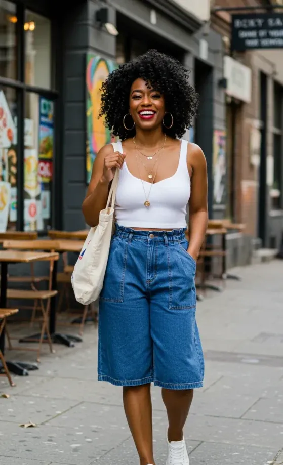 This effortless yet chic summer outfit is perfect for warmer days. The model is rocking a classic white tank top, which pairs beautifully with high-waisted, loose-fitting denim shorts. The relaxed vibe is completed with clean, crisp white sneakers and a simple canvas tote bag. Adding some subtle gold jewelry, including layered necklaces, brings just the right touch of elegance without overdoing it.