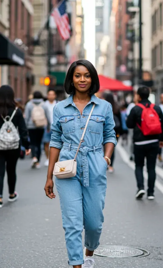This chic denim jumpsuit is the perfect balance of casual and stylish. The light wash of the denim gives it a relaxed, approachable vibe, while the cinched waist and belt add definition to the look. With the button-up front and functional pockets, it s both practical and fashionable. Paired with crisp white sneakers and a small beige handbag, this outfit is perfect for a day out in the city or a casual brunch date.