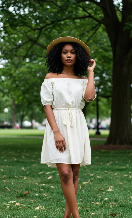 This breezy off-shoulder dress is the epitome of easy summer style. The soft, light fabric gently flows and moves with you, while the gathered waist with a tie creates a flattering silhouette. The neutral tone of the dress is perfectly complemented by the natural accessories, such as the wide-brimmed straw hat and tan sandals. It’s an effortless, comfortable look, perfect for a sunny day out at the park or strolling along the beach.