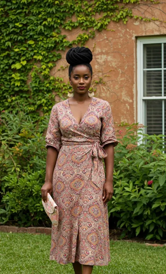 This beautiful wrap dress brings boho vibes to life with its rich paisley print and flowy silhouette. The dress features a deep V-neckline, three-quarter sleeves with a slightly puffed effect, and a flattering tie at the waist. The earthy tones of the print create a warm and inviting look, making it perfect for a day out in nature or a casual brunch with friends. Pairing it with tan sandals and a simple clutch keeps the look effortless yet chic.