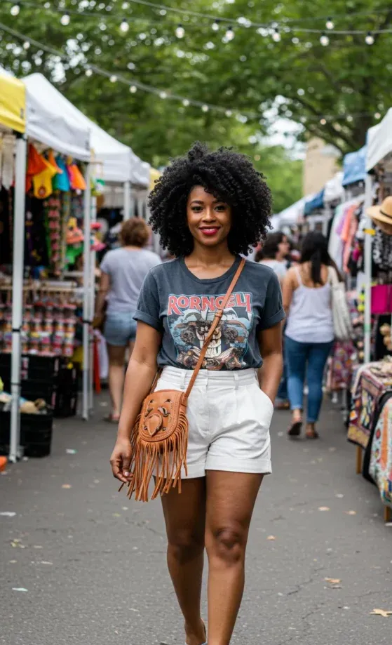 This fun and casual look combines a vintage graphic tee with chic white shorts, perfect for a day out exploring the city or a laid-back weekend outing. The black t-shirt, featuring a bold graphic print, adds personality and edge to the outfit, while the high-waisted, tailored white shorts give it a polished touch. To complete the look, a fringe crossbody bag and multicolored sandals add some boho charm and pop of color.