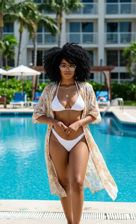 This effortlessly stylish poolside outfit features a classic white bikini paired with a stunning beige kimono cover-up that adds a hint of bohemian flair. The kimono s intricate pattern and flowing design create a relaxed, breezy vibe that s perfect for lounging by the pool or taking a stroll along the beach. A wide-brimmed hat and chic sunglasses complete the look, giving it that perfect sun-kissed, vacation-ready feel.