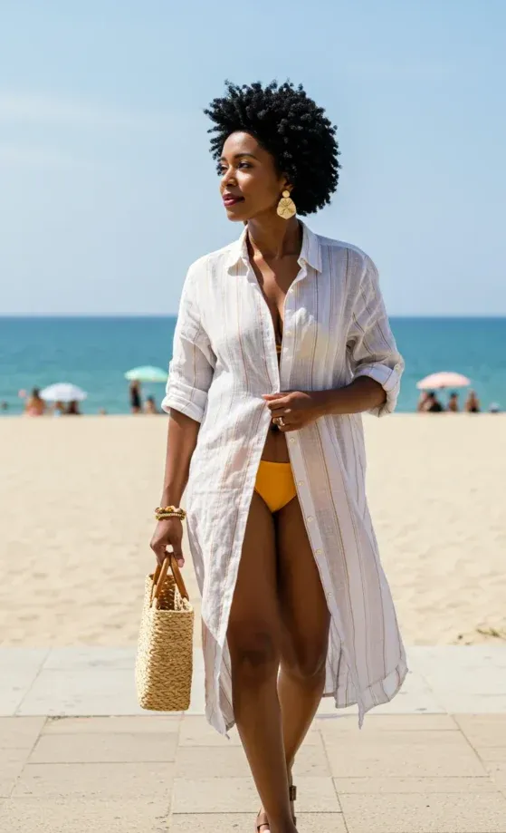 This breezy, striped beach cover-up is a perfect addition to your summer wardrobe. With its lightweight fabric and button-down style, it effortlessly drapes over a vibrant swimsuit, adding just the right amount of coverage while still letting the sunny vibe shine through. The neutral beige and white stripes are complemented by the pop of yellow from the bikini, while the woven straw bag and sandals add a natural, earthy feel to the look. The beachy vibe is completed with oversized earrings and a laid-back confidence.