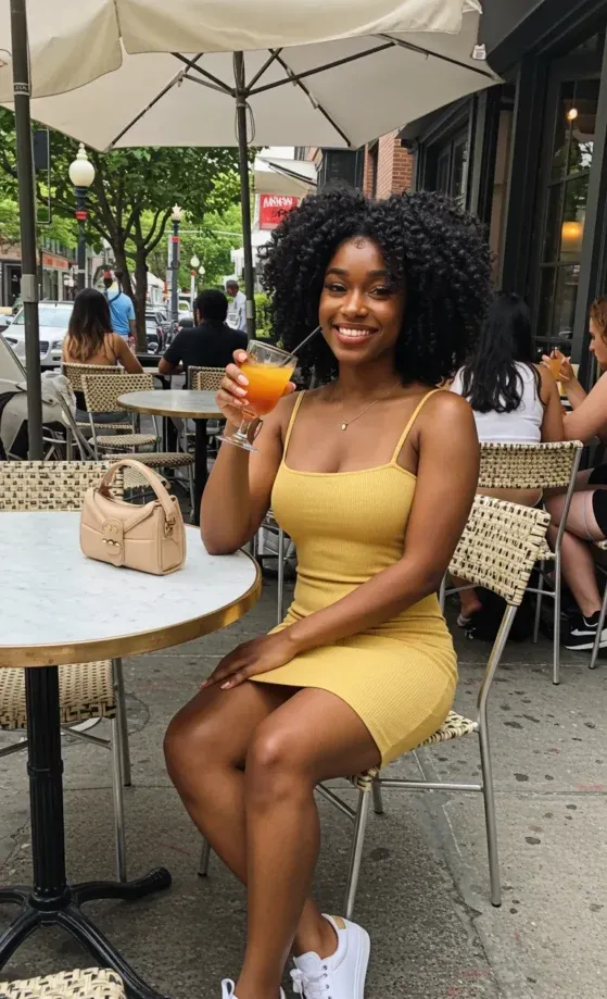 This yellow ribbed mini dress is perfect for a casual day out while still looking effortlessly chic. The fitted silhouette hugs the body in all the right places, while the scoop neckline and thin straps add a delicate touch of femininity. Paired with fresh white sneakers and a neutral clutch, this outfit strikes the perfect balance between comfort and style, making it ideal for a sunny afternoon brunch or a stroll through the city.