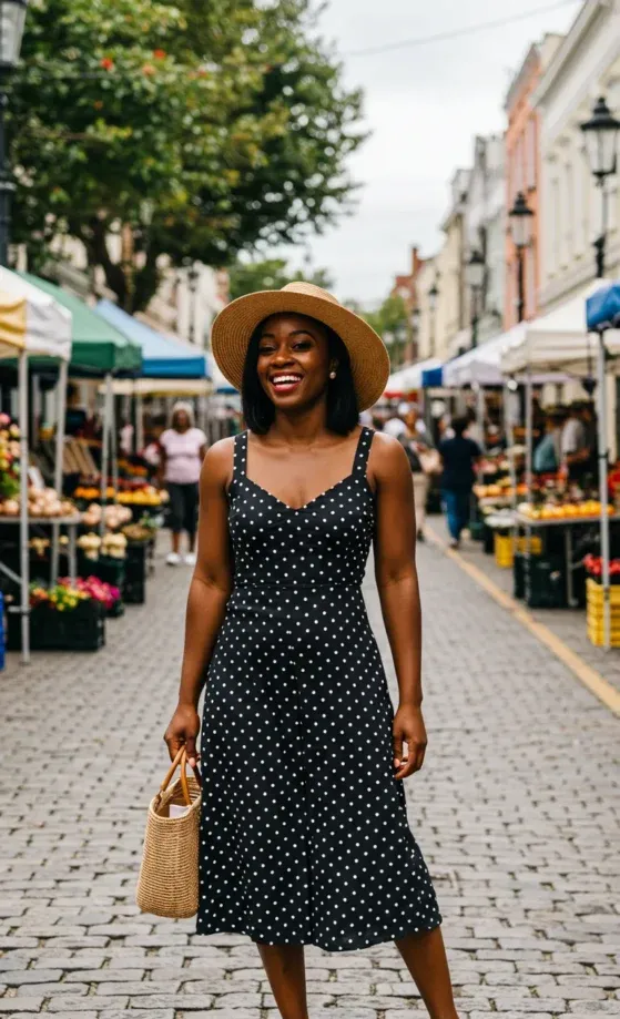 This playful polka dot sundress is perfect for a sunny day out. The fitted bodice with adjustable straps gives it a feminine silhouette, while the flowy, knee-length skirt offers both comfort and movement. Paired with simple white sandals and a natural straw bag, the outfit is both practical and chic. A wide-brimmed hat adds a touch of fun and sophistication, making it ideal for casual outings or strolling through the farmers’ market.