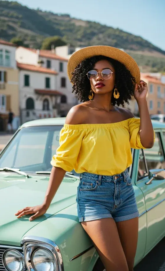 This outfit is the perfect blend of chic and casual for summer. The off-shoulder yellow top adds a pop of color, while the elasticized neckline and puff sleeves keep it comfortable and relaxed. Paired with high-waisted denim shorts, this outfit is effortless yet stylish, perfect for a walk in the park or a coffee date. The finishing touches a wide-brimmed straw hat, bold earrings, and casual sandals complete the look, making it both fashionable and functional.