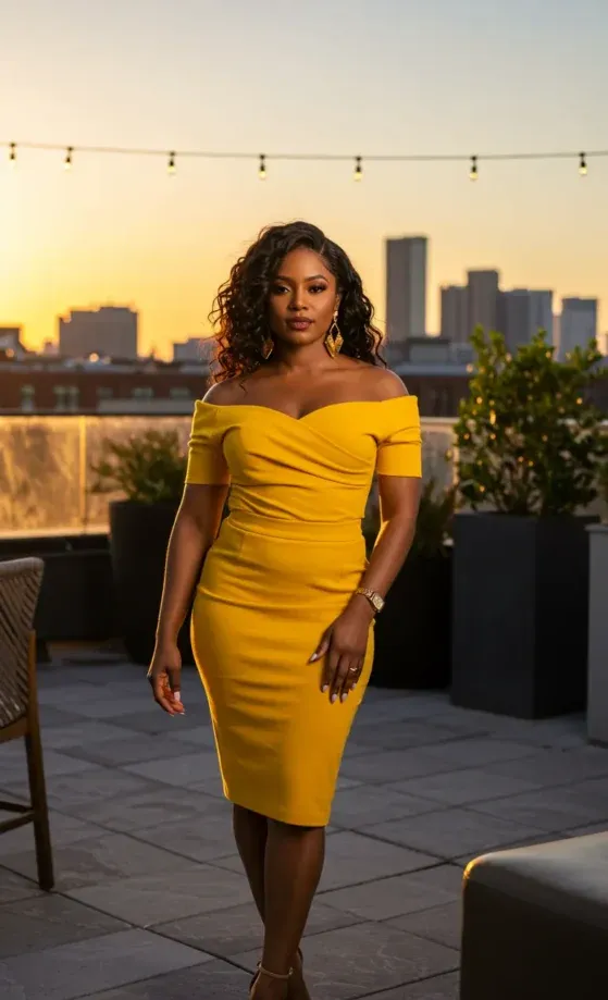 This stunning yellow off-shoulder dress is a showstopper for any summer evening. The fitted silhouette accentuates the curves while the off-shoulder design adds a touch of sultry elegance. The dress hits just at the knee, offering a sophisticated yet playful look, and it’s paired beautifully with strappy nude heels that complement the bold color of the dress. Large statement earrings and a classy watch add the perfect finishing touches.