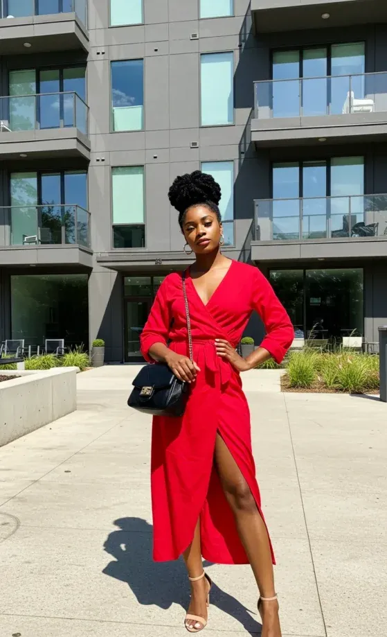 This stunning red wrap dress is the perfect choice for making a statement in the summer. It features a deep V-neckline, a high slit for a touch of sultriness, and long sleeves that balance the boldness of the dress. Paired with nude strappy heels and a chic black handbag, this outfit radiates effortless elegance. The flowy, lightweight fabric moves beautifully in the summer breeze, making it ideal for both daytime events and evening outings.