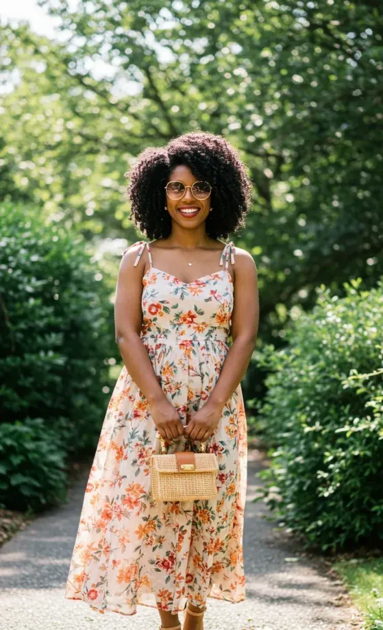 This outfit features a stunning, flowy floral dress in soft pastel tones. The dress has thin straps and a delicate tie detail that cinches the waist, giving it a flattering and feminine silhouette. The playful, blooming floral pattern adds a fresh touch, making it perfect for a sunny day out. Complemented with nude strappy sandals and a chic woven bag, this ensemble is both casual and elegant, ready for any summer outing.