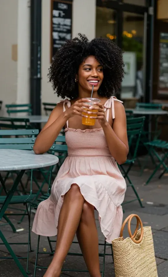 This light, airy dress is perfect for those warm summer days. The blush pink color offers a soft, romantic feel, while the smocked bodice and adjustable tie straps add a playful, feminine touch. The dress flares out into a relaxed skirt, allowing freedom of movement, and the simple design is elevated by the delicate fabric. Paired with comfy white sandals and a woven bag, this outfit is effortlessly chic for a day out in the city or a brunch with friends.