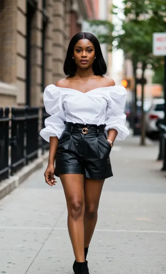 This trendy outfit is all about mixing textures and styles for a chic, city-ready vibe. The off-shoulder white blouse with voluminous sleeves brings a soft, feminine touch to the ensemble. Paired with high-waisted black leather shorts, the outfit strikes the perfect balance between edgy and elegant. Black ankle boots add an extra dose of sophistication, while a sleek belt with a subtle gold buckle cinches the waist for added definition.