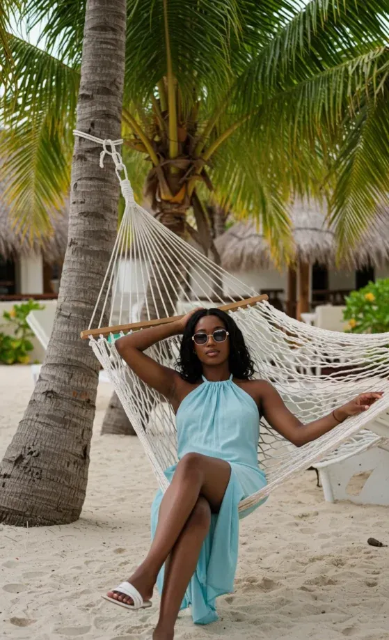 This light, airy dress is perfect for a relaxing day by the beach. The soft turquoise hue and flowy fabric make it ideal for warm weather, while the halter neck and simple silhouette ensure that it s both comfortable and flattering. Paired with white slide sandals and oversized sunglasses, this outfit gives off a chill, vacation-ready vibe. The minimalist style allows the natural beauty of the beach setting to shine through, making it perfect for strolling by the water or lounging in a hammock.