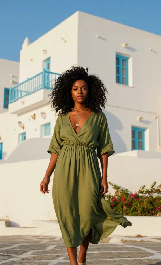This stunning olive green wrap dress is the perfect choice for a summer day spent exploring new places. The V-neck and cinched waist give it a flattering, feminine silhouette, while the relaxed, flowy skirt adds a touch of ease and comfort. The loose sleeves with a slight puff add a bohemian feel, and paired with neutral platform sandals, it becomes the ultimate effortless chic outfit for sunny days.