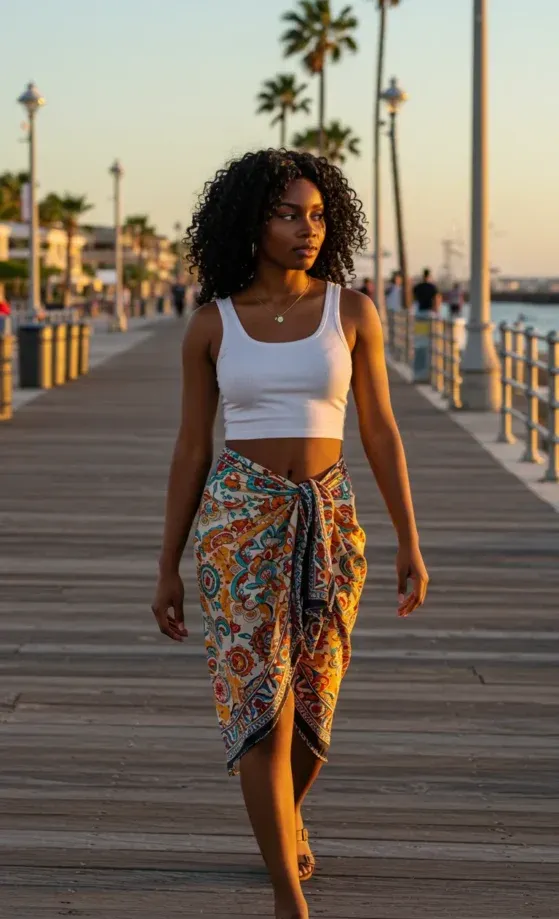 This effortlessly chic outfit is perfect for a stroll along the beach or a laid-back afternoon with friends. The simple white tank top is paired with a brightly colored, paisley-printed sarong wrapped around the waist, bringing a touch of boho flair. The sandals are comfortable and practical, while the minimal jewelry keeps the focus on the fun, playful vibe of the outfit. The look is completed with a relaxed, carefree attitude that makes this ensemble both stylish and comfortable.