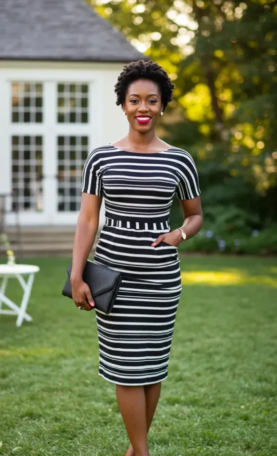 This chic striped dress features black and white horizontal stripes, perfectly hugging the body with a flattering fit. The dress has a subtle cinched waist, enhancing the silhouette while offering a polished look. Paired with bright red heels and a sleek black clutch, this outfit strikes the perfect balance between classic and bold. The vibrant pop of color from the shoes adds a fun twist to the monochrome ensemble, making it ideal for various occasions.