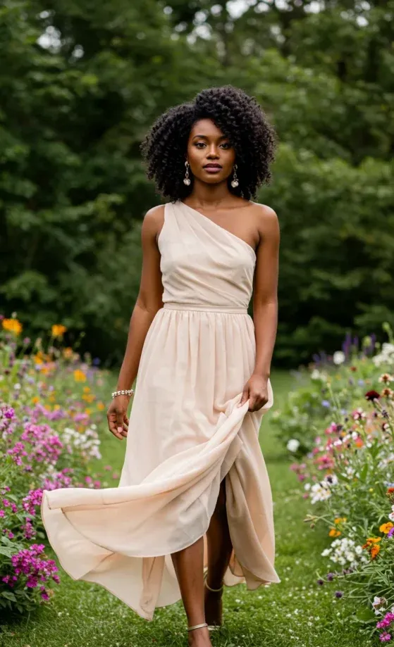 This stunning one-shoulder maxi dress is a perfect blend of elegance and effortless style. The soft, flowing fabric drapes beautifully, creating a flattering silhouette that moves with grace. The light beige color is soft and romantic, and the one-shoulder design adds a modern touch of sophistication. Paired with simple accessories, like a silver bracelet and strappy sandals, this look is perfect for an outdoor summer event or a special evening out.