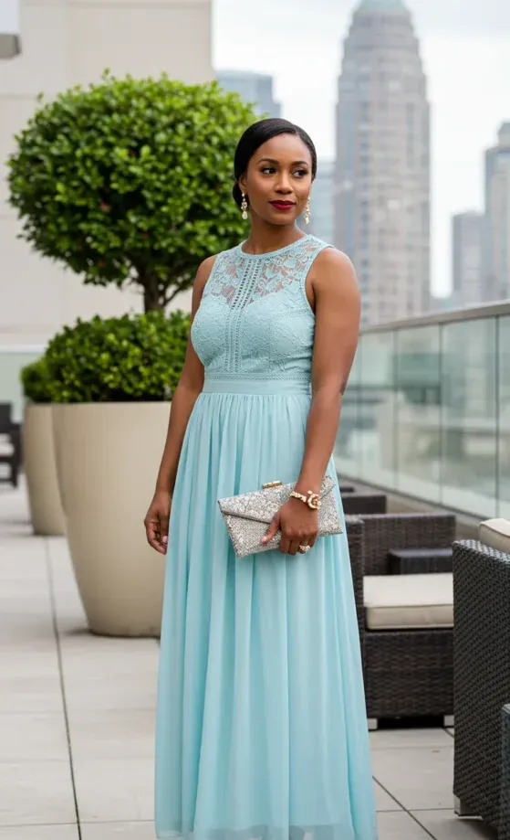 This elegant light blue lace maxi dress is the epitome of summer sophistication. Featuring delicate lace detailing at the bodice, the dress has a soft, flowing skirt that gently moves with every step. The fitted waist and flattering A-line silhouette create a graceful look, while the simple nude heels and sparkly clutch add a touch of glamour, making it perfect for formal summer events or evening gatherings.