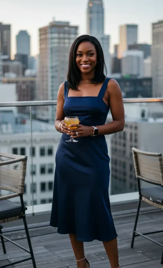 This sophisticated navy square-neck dress features a sleek, figure-flattering design that hits just below the knee. The minimal yet chic structure of the dress is elevated with delicate straps and a flowy A-line skirt that moves beautifully with each step. Paired with nude strappy heels and a subtle golden glow from the city skyline, this outfit radiates both elegance and confidence.