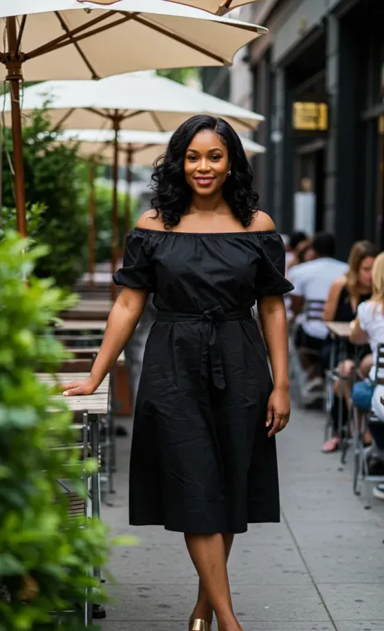 This outfit screams casual chic! The off-shoulder black dress is the perfect balance of simple and stylish. The dress is structured with a tie at the waist, which accentuates the figure while keeping things relaxed and comfortable. Paired with golden metallic sandals, this look feels effortless yet refined. The dress hits right at the knee, making it the ideal length for both daytime and evening outings, while the relaxed fit and feminine details like the off-shoulder design keep it breezy and flirty.