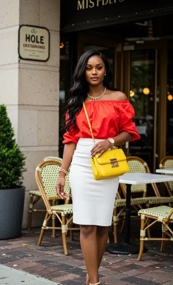 This vibrant outfit pairs a striking red off-the-shoulder blouse with a classic white pencil skirt, creating a chic and sophisticated look. The blouse has a relaxed fit with billowy sleeves that add a touch of drama, while the skirt hugs the waist and hips for a flattering silhouette. Complemented with a bold yellow handbag and nude heels, this outfit is the perfect blend of playful and polished.
