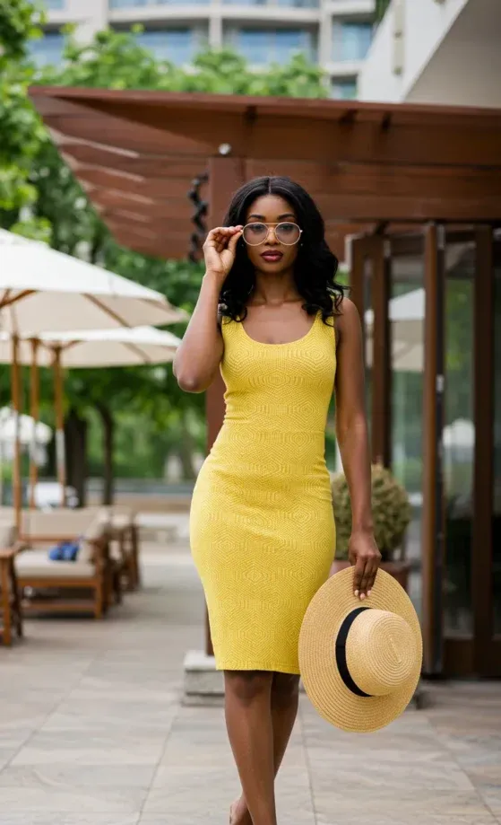 I absolutely love how this outfit screams sunshine and fun! The yellow dress is so eye-catching and perfect for a day in the park or at a café. The bodycon fit is flattering, and the straw hat is a fun, fashionable touch. It s a great combo of trendy and timeless. Plus, the nude sandals are such a perfect choice, not taking away from the bold color of the dress but adding a touch of class. This look is all about feeling free and fabulous!