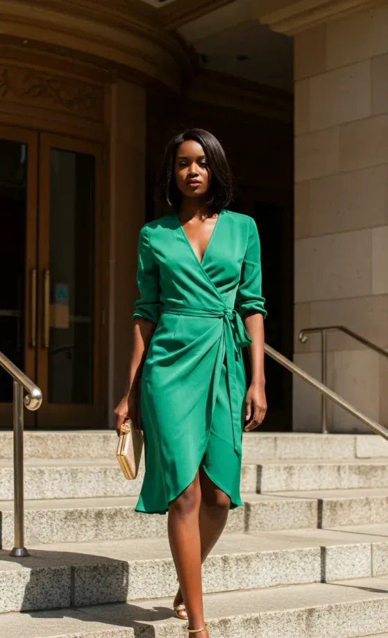 This stunning green wrap dress exudes sophistication and elegance, with its flattering fit and tied waist that enhances the silhouette. The vibrant green color adds a bold pop, while the lightweight fabric flows gracefully, creating a perfect combination of comfort and style. The dress is paired with gold strappy heels and a chic gold clutch, which elevates the look, adding a touch of luxury to the overall ensemble.