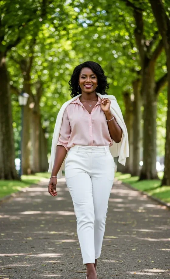 This refined outfit pairs a soft blush-colored blouse with crisp white trousers, creating a classy and sophisticated look. The blouse features a button-up design with a relaxed yet polished fit, while the white pants are tailored to perfection, offering both comfort and a flattering silhouette. The addition of a light jacket draped over the shoulders adds a touch of effortless elegance, completing the look with a neutral beige handbag and nude heels.