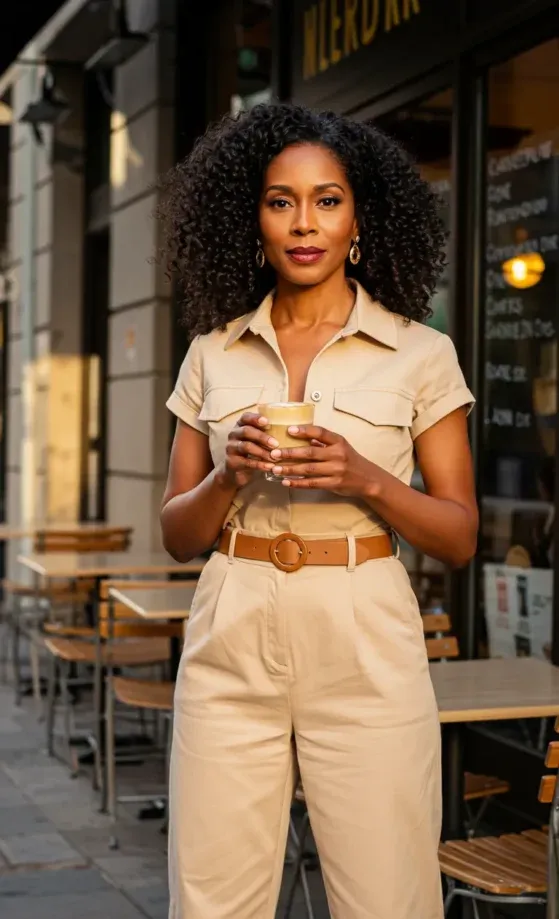 This elegant beige jumpsuit features a classic collared neckline, short sleeves, and a flattering belted waist that creates a streamlined silhouette. The jumpsuit’s wide-leg trousers add movement and comfort while maintaining a sophisticated, tailored look. The chic tan belt complements the neutral tones of the outfit, and the subtle gold accessories along with a fresh cup of coffee enhance its relaxed yet refined vibe.