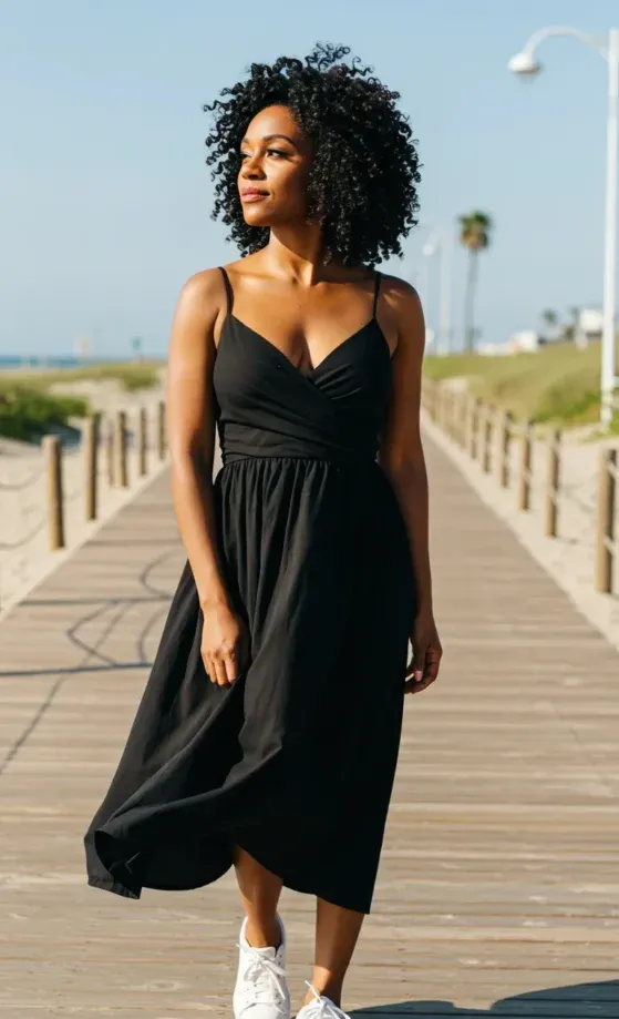 This effortlessly stylish black maxi dress features a deep V-neck and a flowy skirt that falls just below the knee, creating a relaxed yet chic look. The dress hugs the body in all the right places, with a comfortable fit and soft fabric that moves beautifully with every step. Paired with crisp white sneakers, this outfit is perfect for a laid-back day out or a casual evening stroll along the beach.