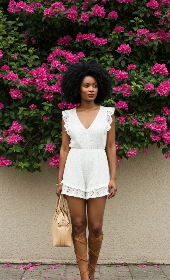 This playful white lace romper is perfect for a sunny day, featuring a v-neckline and delicate ruffled edges for a feminine, airy touch. The lace detailing adds a touch of sophistication, while the cinched waist ensures the romper flatters the figure. Paired with tan gladiator sandals and a matching handbag, this outfit is both stylish and comfortable. The backdrop of vibrant pink flowers only enhances the fresh, chic vibe of this look.