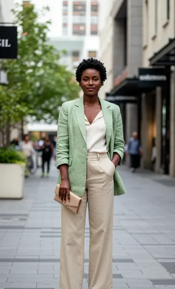 This outfit brings together an effortlessly chic combination of a mint green blazer and beige high-waisted trousers. The relaxed fit of the blazer adds a laid-back yet sophisticated vibe, while the pleated trousers give the ensemble an elegant silhouette. The look is completed with a cream blouse that peeks out from under the blazer and a simple clutch bag, giving it a polished and understated finish. The soft mint green adds a fresh pop of color, perfect for a sunny day out, a brunch date, or even a work setting.