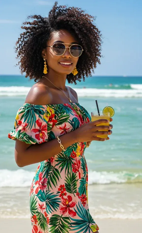 This outfit is a playful and vibrant tropical floral dress that features off-the-shoulder sleeves and a flattering cinched waist. The dress is adorned with a mix of lush green palm leaves and bold, colorful hibiscus flowers on a soft pink background, perfectly capturing the essence of a beach day. The addition of large, statement earrings and round sunglasses gives this look an extra touch of fun, while the refreshing drink in hand adds to the relaxed, vacation-ready vibe.