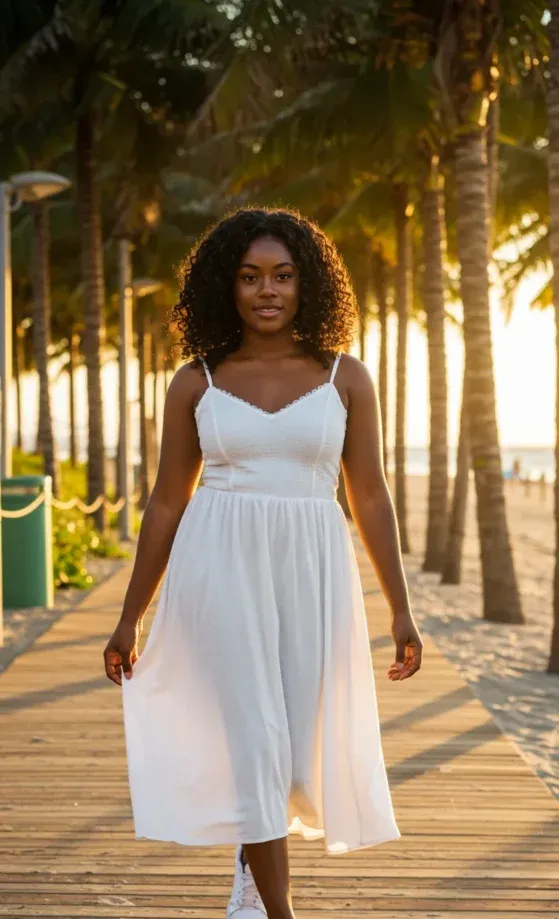 This breezy white smocked dress is perfect for those casual summer days, offering a comfortable fit while still looking effortlessly chic. The dress features delicate spaghetti straps and a flattering smocked bodice, while the loose skirt flows gracefully around the legs. Paired with crisp white sneakers, this look is both laid-back and trendy, creating a perfect combination of comfort and style. The beachside backdrop adds to the relaxed yet elegant vibe of this outfit.