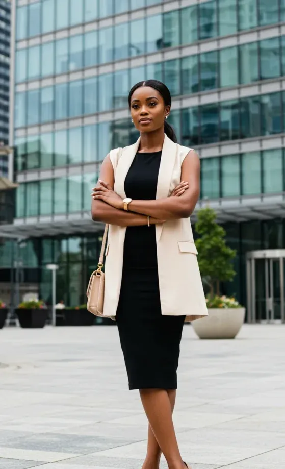 I absolutely love how this outfit strikes the perfect balance between professional and fashionable. The simplicity of the black dress is elevated by the beige vest, making it suitable for a variety of occasions from a business meeting to a classy lunch out. Plus, those nude heels are such a great way to elongate the legs while keeping the focus on the outfit’s elegant silhouette. This look is definitely a go-to for anyone wanting to look both chic and confident this summer!
