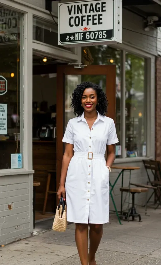 I love how effortlessly this dress balances sophistication and comfort. The crisp white color makes it versatile and fresh, while the belt adds structure and style. It’s the kind of dress that can easily transition from a coffee run to an afternoon meeting. The addition of gold accessories elevates it without making it feel too formal, making this outfit ideal for a laid-back yet polished look. Plus, the fabric is breathable, perfect for those warm summer days when you want to stay chic and cool!