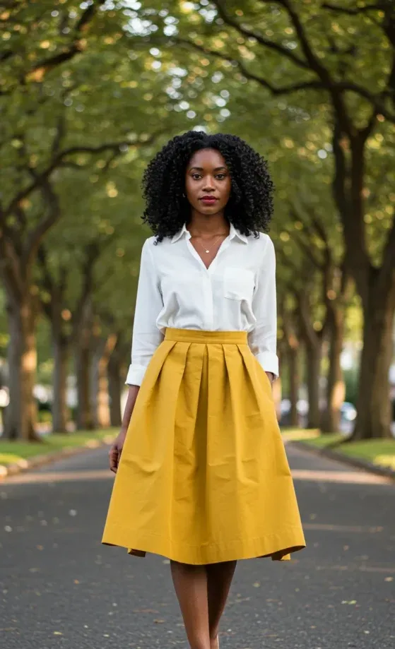 I adore how effortlessly chic this look is! The white blouse is a wardrobe staple, and the mustard skirt adds just the right amount of color and warmth. It s playful yet sophisticated, and the pleats give the skirt a beautiful, airy feel that moves so gracefully. This outfit is versatile and perfect for everything from brunch with friends to a casual day at the office. I love that it s both comfortable and stylish while still feeling fresh and trendy for the season!