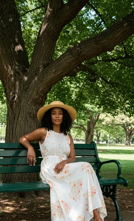 This look is the epitome of effortless summer style. The soft white maxi dress is adorned with a delicate floral pattern in shades of peach and yellow, which adds a feminine and playful touch to the outfit. The dress features a relaxed fit with a subtle cinched waist, and the lightweight fabric flows beautifully, making it perfect for a warm day. Paired with strappy sandals and a wide-brimmed hat, this outfit exudes casual elegance and is ready for a garden stroll or a day out with friends.