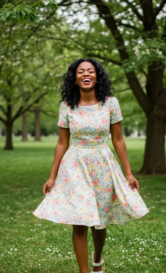 I can’t get enough of how this dress makes you feel so light and free! The floral pattern is perfect for summer, adding a fresh and cheerful vibe. It s the kind of dress that makes you want to twirl, and the soft fabric is both breezy and flattering. The white sandals complete the look effortlessly, making this dress perfect for everything from a picnic in the park to a fun day out with friends. I would totally wear this to soak up the sunshine!