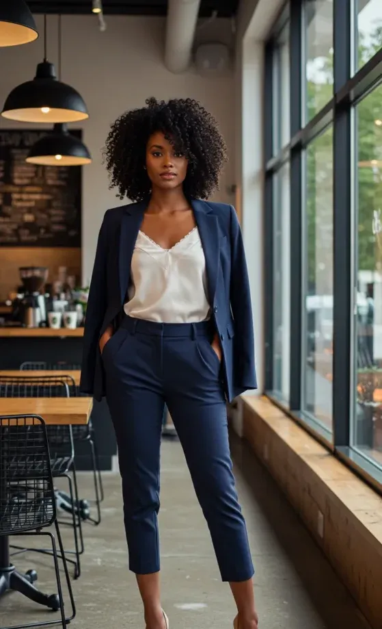This polished and professional look pairs a navy blue blazer with tailored trousers, creating a sophisticated silhouette. Beneath the blazer, a soft satin cream-colored top adds a luxurious touch, contrasting beautifully with the sharpness of the suit. The combination is completed with a pair of nude heels that further enhance the refined nature of the outfit, making it perfect for a stylish day at the office or an elegant business event.