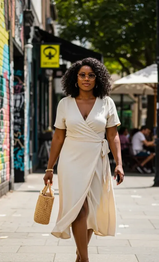 This stunning look features a soft beige wrap dress that s effortlessly elegant. The dress has a flattering V-neckline and is cinched at the waist with a tie belt, creating a beautiful silhouette. The fabric flows gracefully to knee length, offering both comfort and style. Paired with tan strappy sandals and a chic woven bag, this outfit is the perfect mix of sophistication and laid-back ease. The subtle texture of the dress adds depth, while the accessories elevate the overall look, making it ideal for a sunny day out.