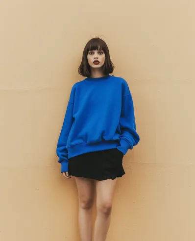 This bold and edgy look features an oversized electric blue sweater that s all about comfort and drama. Paired with a sleek black mini skirt, it creates a striking contrast between cozy and flirty. Chunky black boots with metal details add a rebellious touch, giving the outfit serious attitude.
