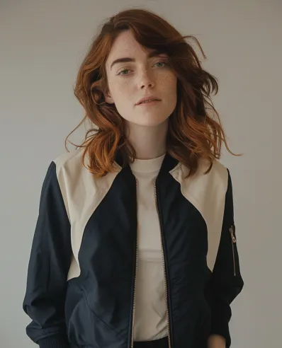 This outfit exudes understated cool with a sleek black-and-white two-tone bomber jacket layered over a crisp white tee. The structured jacket adds a sporty, modern touch, while the simple pairing of black trousers keeps the look polished yet casual. It’s the perfect balance of monochrome chic and arcade-ready comfort.