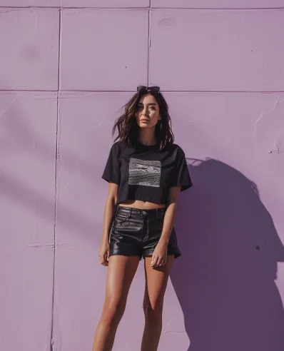 This outfit serves serious attitude with a trendy graphic crop top paired with sleek black leather shorts. The shorts’ high-waist design creates a leg-lengthening effect, while the white sneakers keep the vibe playful and laid-back. Topping it off with black sunglasses gives just the right hint of cool-girl confidence.