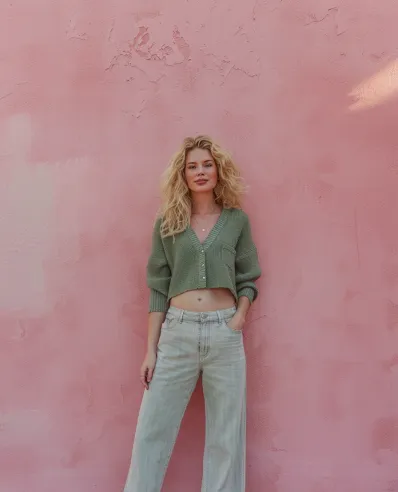 This look brings cozy vibes with a twist. The cropped sage-green cardigan feels soft and feminine, with its delicate button details adding a cute touch. Paired with light, wide-leg jeans and white sandals, it strikes a lovely balance between relaxed and polished. Perfect for a day-to-night arcade date!