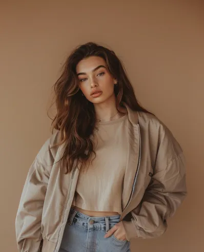 This outfit keeps it effortlessly cool with soft, earthy tones. The oversized beige bomber jacket adds volume and warmth, while the cropped tee underneath brings a casual touch. Light-wash, ripped jeans balance the look with a hint of edge, making it both laid-back and stylish.