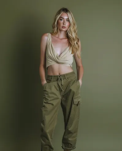 This outfit combines effortless cool with a trendy twist literally! The beige crop top features a chic twisted front design, adding texture and flair. It s perfectly paired with olive-green cargo pants that offer both comfort and style with their relaxed fit and utility pockets. Classic white sneakers keep the look fresh and ready for action.
