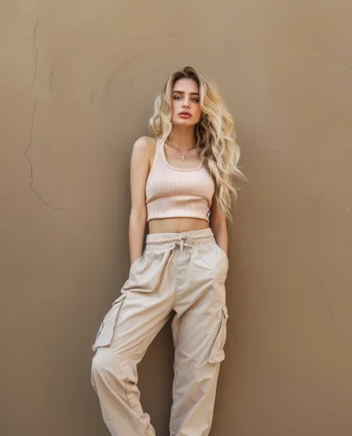 This outfit is all about relaxed monochrome perfection. The ribbed beige crop top offers a sleek, fitted silhouette, while the loose, drawstring cargo pants keep things casual and comfy. White sneakers round off the look, keeping the neutral tones fresh and effortlessly stylish.