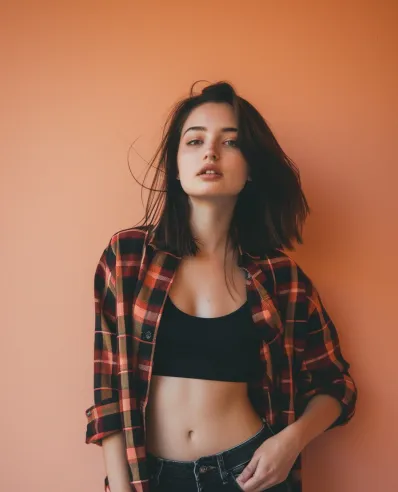 This outfit is effortlessly cool with a cropped black tank top and high-waisted denim shorts, topped off by a loose, unbuttoned plaid shirt. The plaid brings a pop of color and a laid-back vibe, while the fitted tank and shorts combo keep it casual yet flattering. Perfect for layering in case the arcade gets chilly!